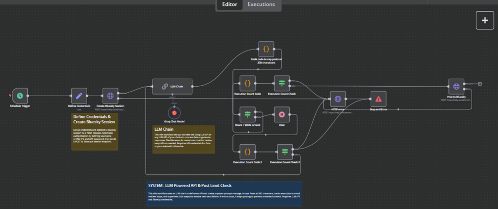 This workflow taps into an LLM API (like Openai or your favorite model) to whip up custom content from your prompts. It then trims it to fit Bluesky’s 300-character limit, authenticates via the Bluesky API, and posts it seamlessly. Smart checks keep errors at bay, delivering a smooth, hands-off content strategy.
